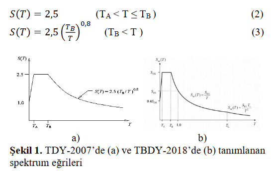 2.1. Spektrum Eğrilerinin Elde Edilmesi TDY-2007’de spektrum eğrisinin apsisi periyodu (T) ordinatı spektrum katsayısını (S(T)) göstermektedir (Şekil 1a). Burada S(T) yerel zemin koşullarına (TA ve TB) ve bina doğal