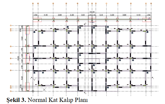 Normal kat kalıp planı Şekil 3’te gösterilen binalar, zemin kat yüksekliği 3,00 m ve normal kat yüksekliği 2,80 m olarak tasarlanmıştır. Binaların toplam kat yüksekliği; 4 katlı binalarda 11,40 m, 7 katlı binalarda 19,80 m ve 10 katlı