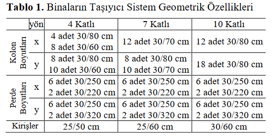 düzeyi yüksek betonarme çerçeve ile süneklik düzeyi yüksek boşluksuz betonarme perdelerden oluşan taşıyıcı sistem tercih edilmiştir. 3 farklı bina yüksekliğinde kullanılan taşıyıcı eleman özellikleri Tablo 1’de verilmiştir.