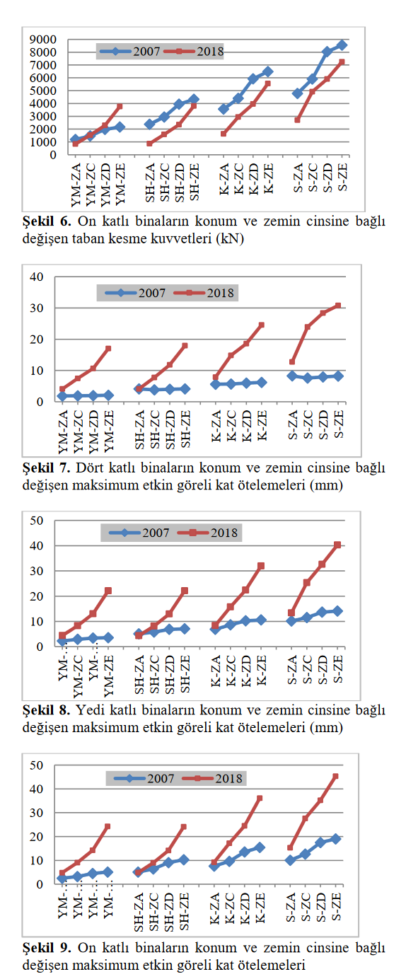 Z2, ZD-Z3 ve ZE-Z4 zemin sınıflarında 2007 yönetmeliğine göre bulunan taban kesme kuvvetlerinin, 2018 yönetmeliği değerlerinden daha düşük, diğer bütün konum ve zemin cinslerinde daha yüksek değerler aldığı görülmüştür (Şekil 6). TBDY-2018’de çok büyük olmayan depremlerde, dolgu duvarı veya cephe hasarının azaltılması amacıyla, gevrek malzemeden yapılmış dolgu duvarları ile bunların bağlandığı çerçeve elemanları arasında esnek derz yapılması koşuluyla, izin verilen etkin göreli kat ötelemesi iki katına çıkarılmıştır.